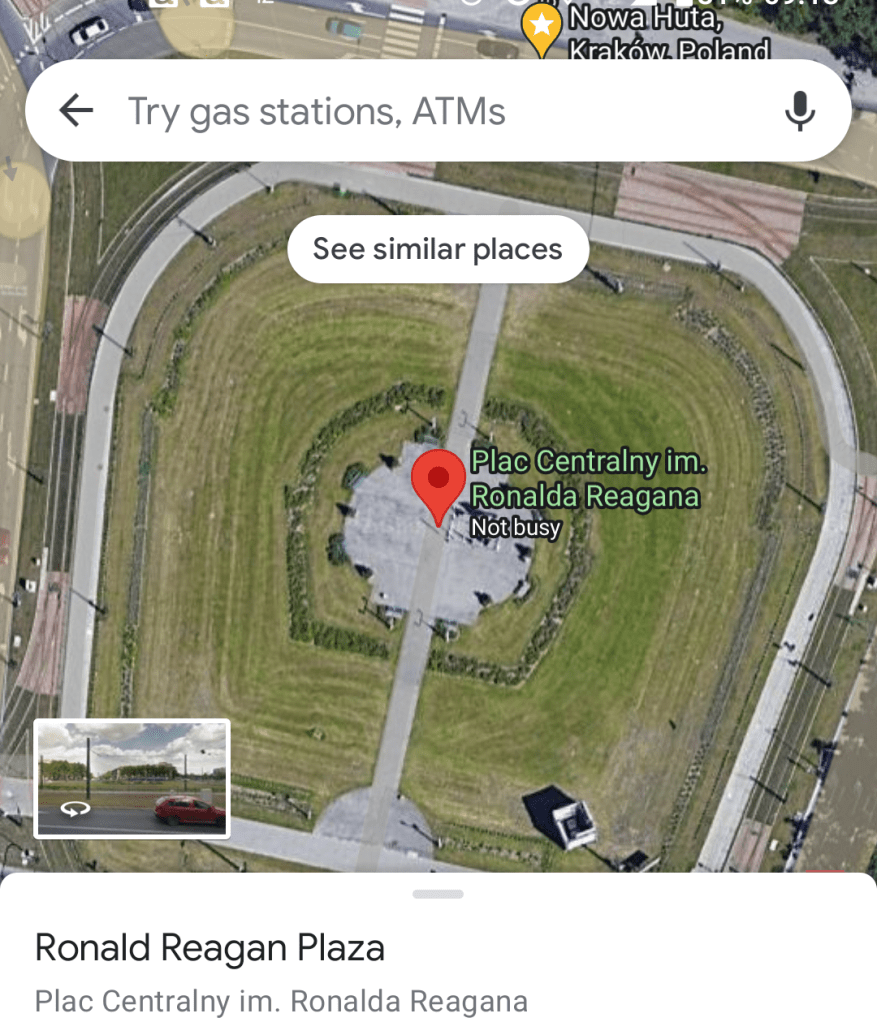 Another unique site I visited on Saturday was Nowa Huta, a huge planned workers’ town five miles outside of Krakow. You get a sense of the enormous but stark aesthetics of Communist architecture. According to Rick Steves, it’s one of only three towns outside the Soviet Union that were custom-built to showcase socialist ideals. Nowa Huta’s Central Square was recently and aptly renamed for Ronald Reagan, recognized as a staunch anti-Communist. It’s so large that it’s somewhat difficult to appreciate at street level, but a satellite view from Google Maps gives a better perspective.