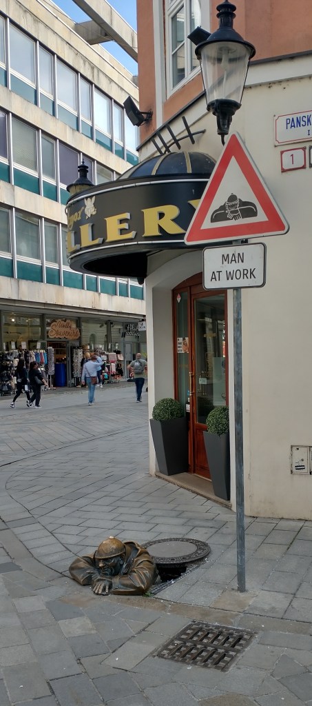 Years ago, in the 90s, Bratislava city leaders decided to put some unique statues up around the old town to help draw visitors, with these not being directed to anyone famous or even to anyone particular at all. Here are a few: