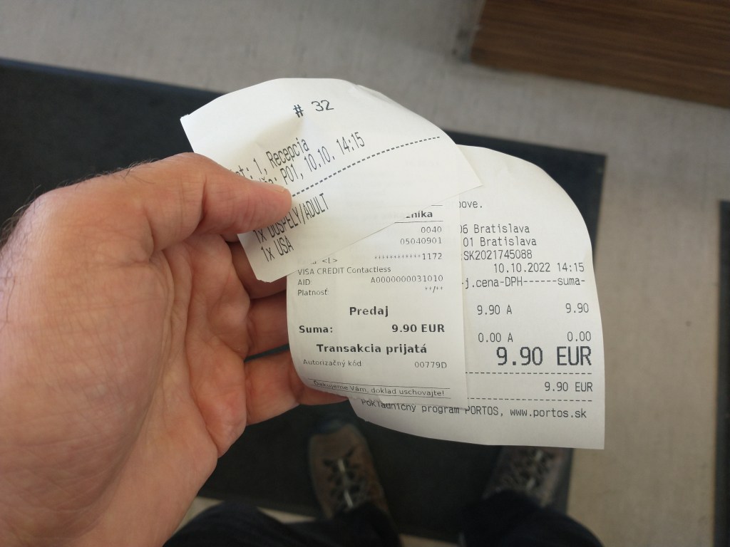 The bridge has two levels: the top is for cars, and the lower level is for pedestrians and bikes. Looking back at Bratislava, you can see an example river cruise boat on the left. I met some American folks who took the catamaran (just to the right of the cruise ship) in from Vienna for a day trip. To the right of the catamaran there is a multi-story boat that seems as if it might tip over at any moment! A couple from Washington state had just finished a Rick Steves tour that ended in Vienna, and one of them took a photo of me. In the middle distance you can see rows upon rows of old Communist-era apartment buildings. Colleen and I saw these in 1998 on our drive through, but they’ve since been painted bright colors to spruce them up a bit. The view of them really seared into my brain in ’98, and not in a good way. You can see the UFO tower rising above the trees to the left, along with the city castle to the right. An example of the excess pieces of paper one tends to get in Central Europe for one purchase.