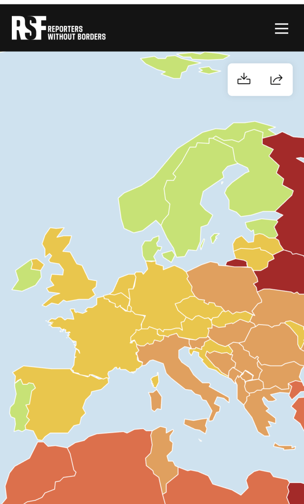 Green is good, yellow is satisfactory, light orange is problematic, dark orange is difficult, and dark red is very serious. So Portugal is good; Czechia, Slovakia, and Croatia are satisfactory; but Poland and Hungary are problematic; and Russia is very serious. (The US is “satisfactory”.)