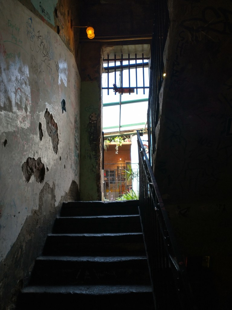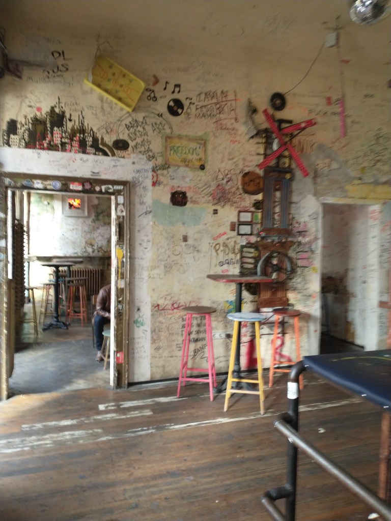 While I visited multiple ruin pubs, the photos below are from Szimpla Kert alone! One can wander through the old creaky-floored hallways, up and down stairwells, and in and out of various ramshackle and graffitied rooms. There are places to get food, along with multiple bars, all inside the one building. On an early Sunday afternoon, there was a farmers’ market being held in the entrance hallway and anterooms. Here’s a Google Maps link so you can see more photos, including from nighttime, if you want: