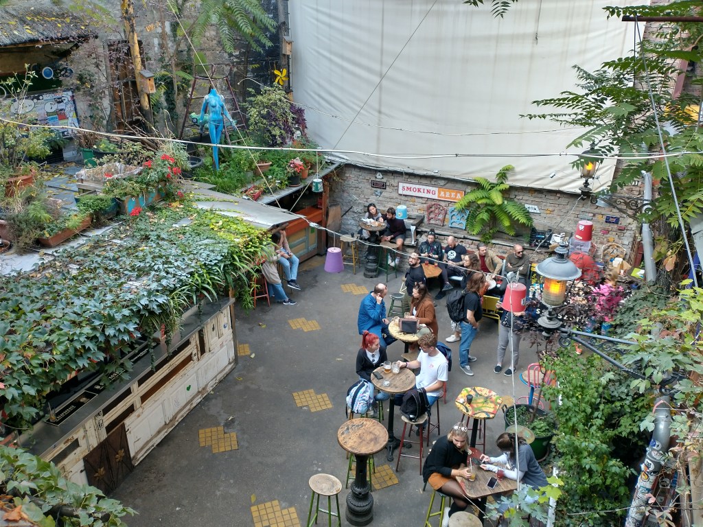 Sofia told me that she came here in 2021 when she and friends visited Budapest. It’s as if you put together a collection of hipster West Asheville establishments, like Wedge Brewing of the old days, plus Fleetwood’s, plus Odditorium, plus Battle Cat, and then made it bigger. It’s a weird juxtaposition of festive and eery.