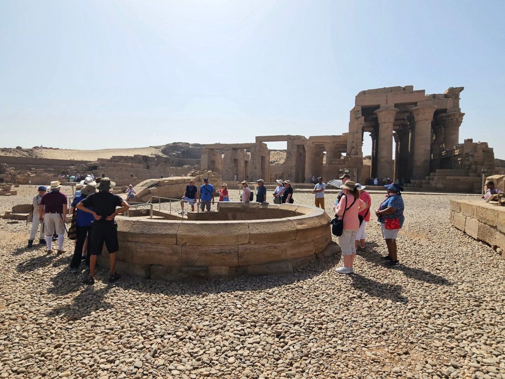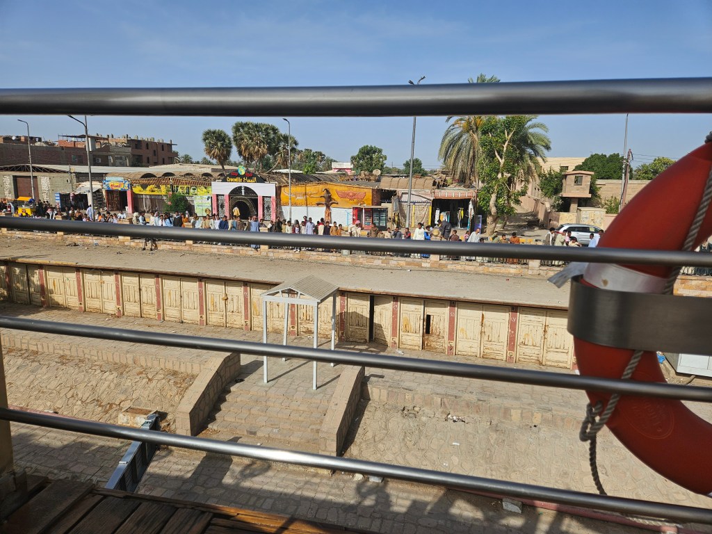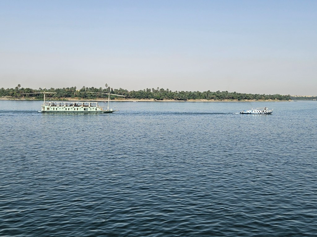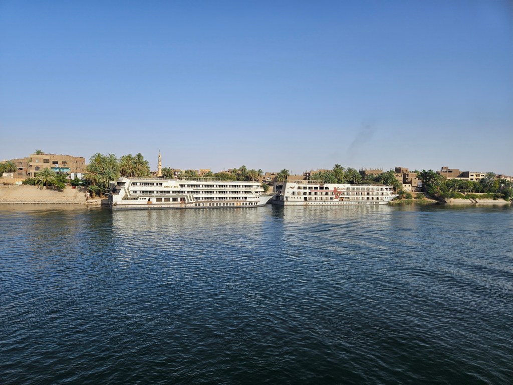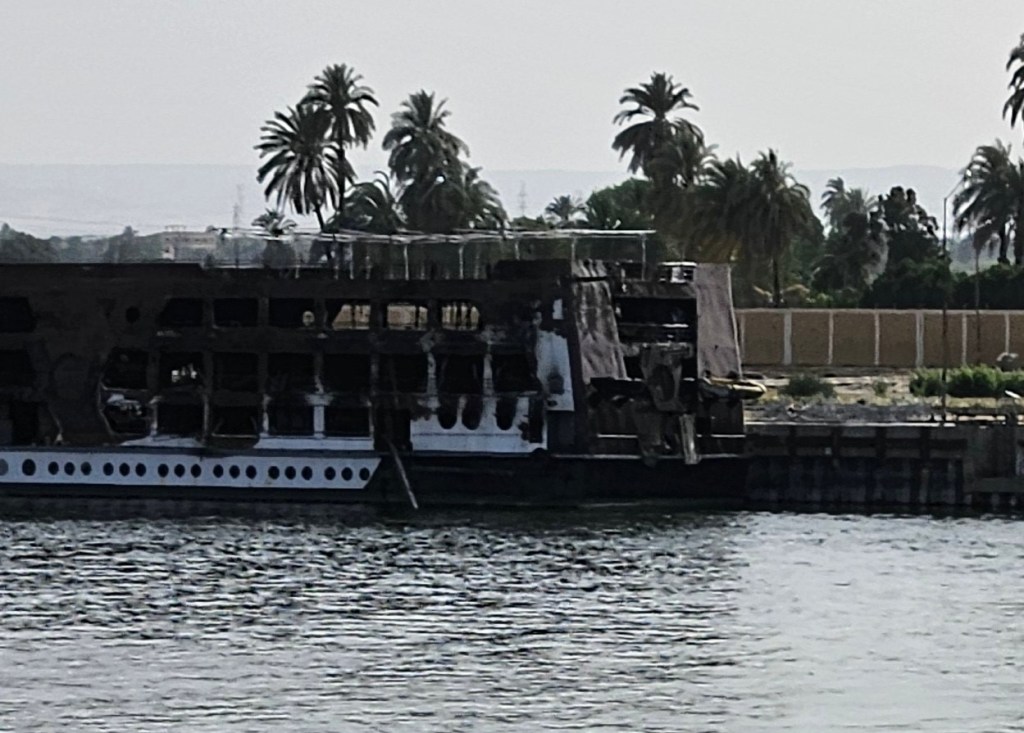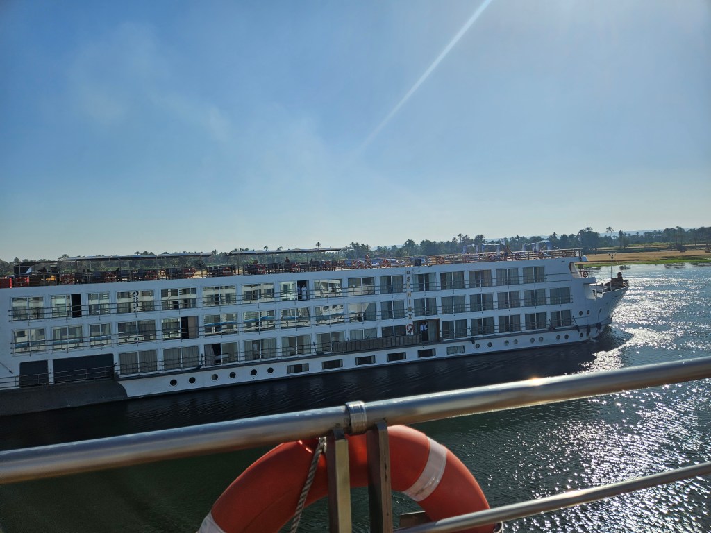 I overheard a tour guide tell a passenger on our ship that there are over 100 cruise ships regularly plying the Nile, and based on what we’ve heard, the various ship captains know each other well — it’s a fairly small and tight community. Interestingly, there are numerous “ghost ships” moored along the riverside in various places, with these ships appearing to be well past their prime. I’m not sure if they’re meant to be repaired, but some look to have been hanging out forlorn for several years, including one that clearly caught on fire at some point. Apparently, tourism in Egypt has been heavily depressed for many of the past 12 years, given the revolution that began in 2011 and wasn’t really resolved until 2018, followed not long thereafter by Covid. So it seems like there’s still some catching up to be done, though things are finally good again currently, therefore perhaps some of these ships will return to service again one day. Additionally, some of the Nile’s ships are sailboats, but our tour guide said that they can typically only use their sails to get sufficient speed to keep their schedule about 25% of the time, so during the other times they’re towed by a tug boat.