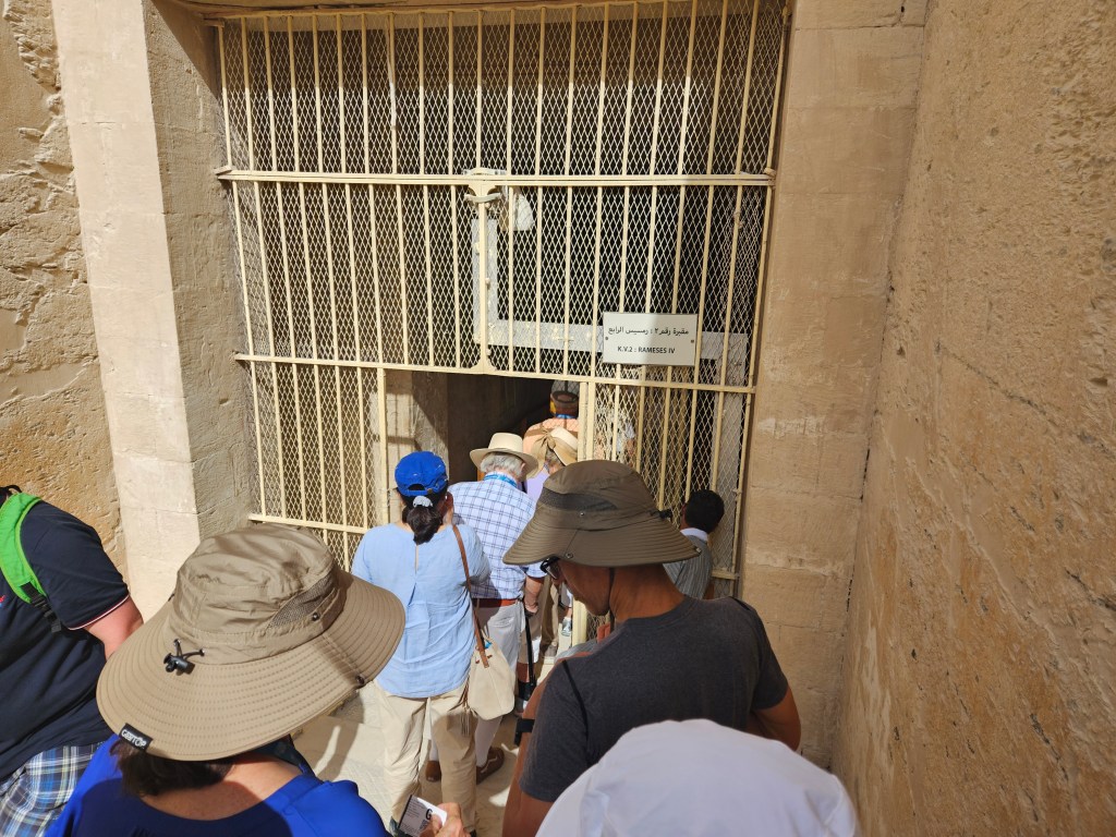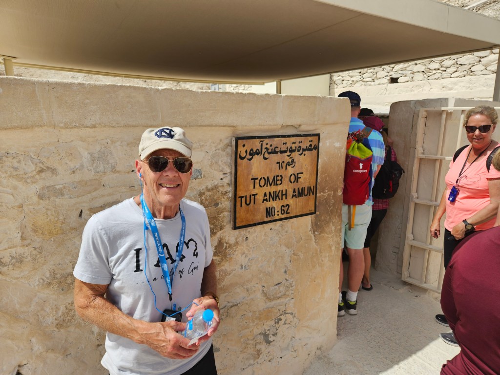 Now, for continued details on our Nile experiences… On the western side of the Nile, across from the temples in Luxor, is the Valley of the Kings where numerous pharaohs were buried in an attempt to avoid tomb robbers attracted by the ostentatious giant pyramids that earlier pharaohs used to erect farther north by Cairo. The eastern side of the Nile (where the sun rises) was where the living resided, while the dead resided on the western side (where the sun sets). The hidden tombs didn’t always prevent theft, but Tut’s tomb wasn’t rediscovered until 1922, and then became the most famous tomb find, especially given its trove of treasures. So far 65 tombs have been officially found in this desolate and blazingly-hot rocky valley, with Tut’s being the 62nd. Many of the tombs are open for visitation, and some are elaborately painted. Tut’s tomb is a bit of a let-down because it’s not as fancy as some others, though it did have so many items that were removed, thousands of which were sold to private vendors. That said, Tut himself still rests there, albeit in an exposed glass case. Presumably not what he had in mind.