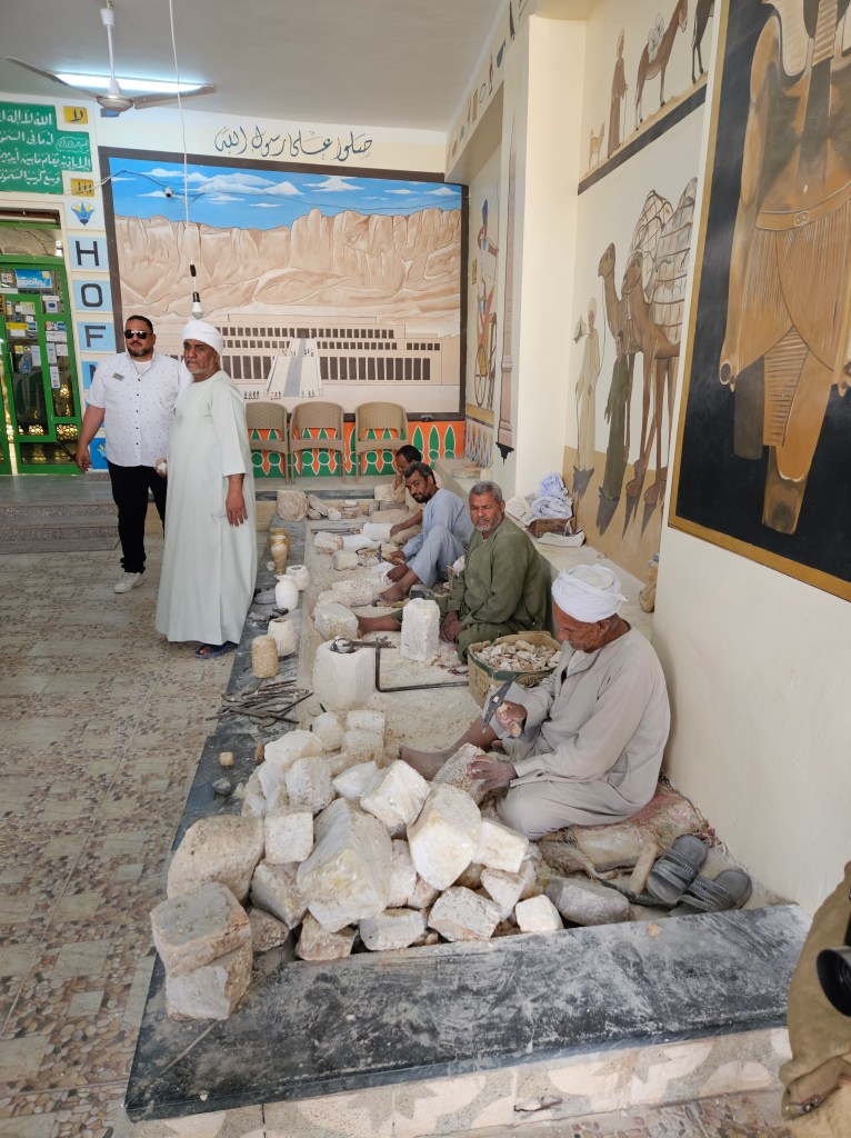 An aspect of all the touring that did become tiring was that the tour company kept bringing us to different shops, like one offering various carved stone items, another with papyrus artwork, a store selling Egyptian cotton products, and more. And somehow every temple complex has a true gauntlet of pushy vendors, sometimes with several dozen stalls. The more aggressive sellers step right into your path, and one guy even put a scarf onto my shoulder while I was passing by. I kept walking, told him I didn’t want it, and suggested that he remove it from my shoulder. He eventually did. I hadn’t wanted to dump it off, lest the clean white scarf get sullied in the dust on the ground.