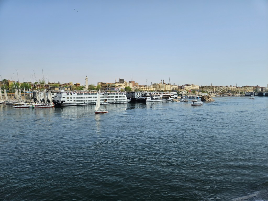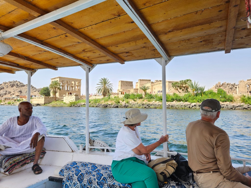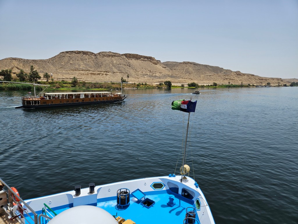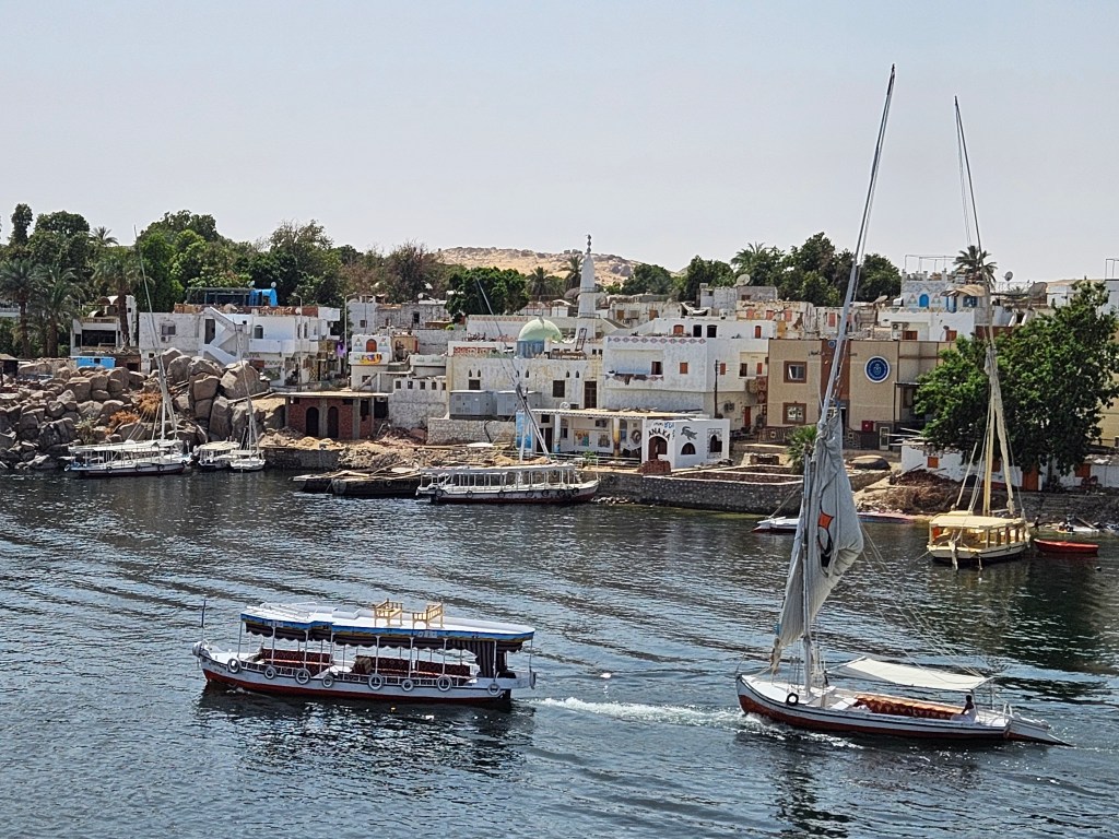 Somewhat confusingly, upper Egypt is farther south than lower Egypt, but that’s just because of our concept of north and south. Upper Egypt is higher up altitude-wise, and logically the Nile flows from upper elevations to lower ones all the way to the delta in northern Egypt out to the Mediterranean. After Luxor and Kom Ombo we headed south on the Nile all the way to the city of Aswan, the most beautiful place we saw along the Nile. In the Aswan region the desert often directly ends at the Nile, with little or no green between, and there are large sandy hills in the area.