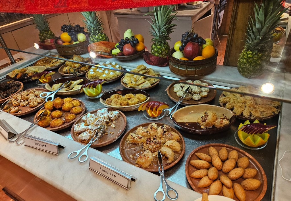 One of the many things I loved about the cruise was the food, particularly when they offered Egyptian dishes. And man, the juices! Mango, date, strawberry, guava, orange, and more. I’d never had date juice before, and it was delicious.