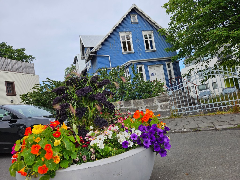 The weather is relatively harsh in Iceland, and even in the middle of August we found ourselves often needing two jackets, gloves, and stocking caps to keep warm. It’s frequently gray and windy too, though we were fortunate to have been blessed with lots of sun during our visit. Understandably, locals like to liven up their surroundings, so they often paint their houses with bright colors, and in these warmer months they grow as many colorful flowers as possible.