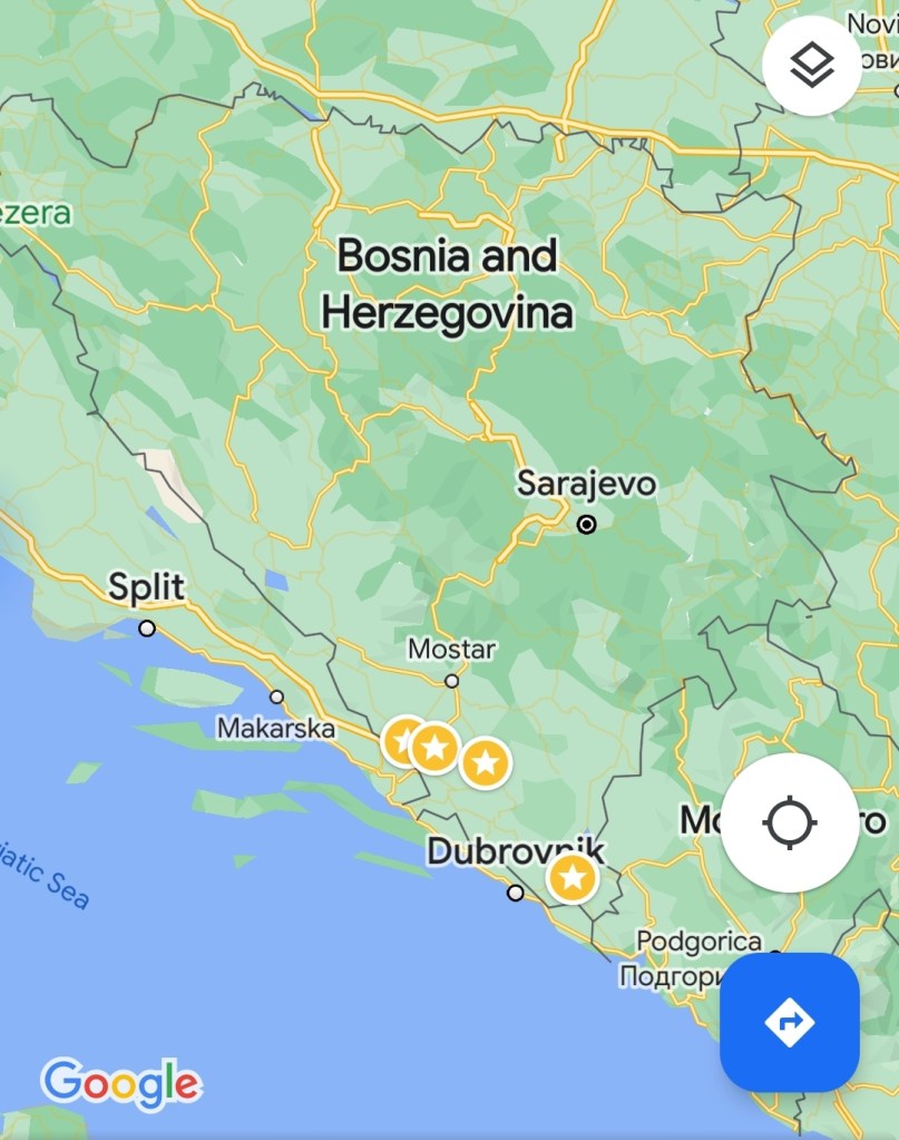 B&H has a long and complicated past, along with a continued complicated present. The country was the heart of much of the worst fighting and atrocities during the early 1990s after declaring independence from Yugoslavia, and in cities like Mostar and Sarajevo, one can witness the residual scars almost 30 years later. The population is now 3.5 million, but has been decreasing as youth seek opportunities elsewhere. There are three main ethnic groups, with these being, in decreasing order of population: Bosniaks (Muslim), Serbs (Christian Orthodox), and Croats (Christian Catholic), and as I drove through the country, I could see neighborhoods with Serbian or Croatian flags, presumably signifying the predominant group in that area.