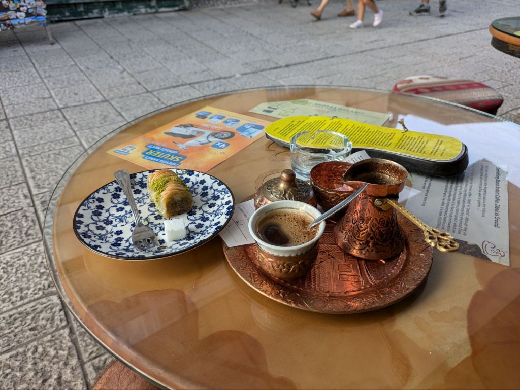 There are a handful of different kinds of Bosnian eateries in Sarajevo. There are ćevabdžinica restaurants serving ćevapi, grilled beef sausages in pita bread with raw onions, and preferably kajmak, a boiled and fermented unpasteurized milk. It’s a filling and cheap meal, but not one that I wanted to keep eating every day. Then there are buregdžinica establishments which offer various “pita” (pies), including burek, which is made with chopped or ground beef, onions, and spices, which are rolled in layered phyllo dough. Other varieties include cheese or spinach and cheese, for example. I find these all to be too greasy for my tastes – I’d prefer ćevapi if I had to choose. But what are even better are the traditional Bosnian restaurants serving fresh stews and various dishes like people make at home. One example of this type of establishment is an aščinica, which is a cafeteria-style place where you point a server to various prepared foods in a display case to put together a meal for yourself – it can be tricky because there are no labels on the food, and the prices are listed in a small frame on the entry wall, with the dish names only in Bosnian. But hand gestures can do the trick, and besides, I found that folks in Sarajevo often speak good English, much better than in Czechia.