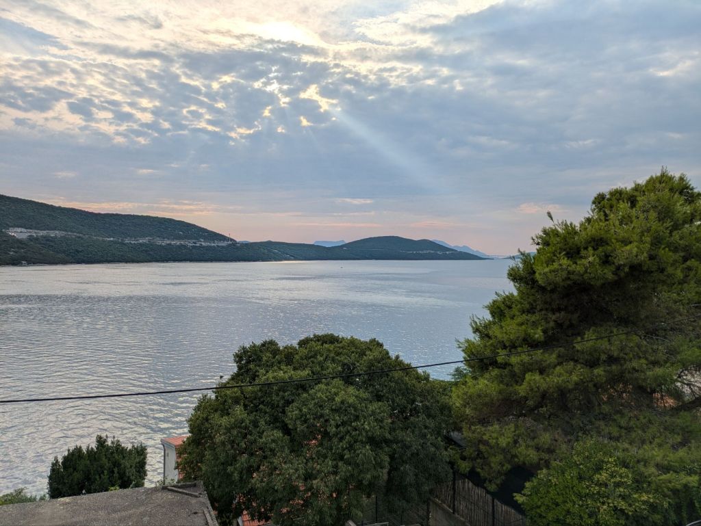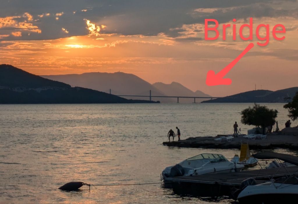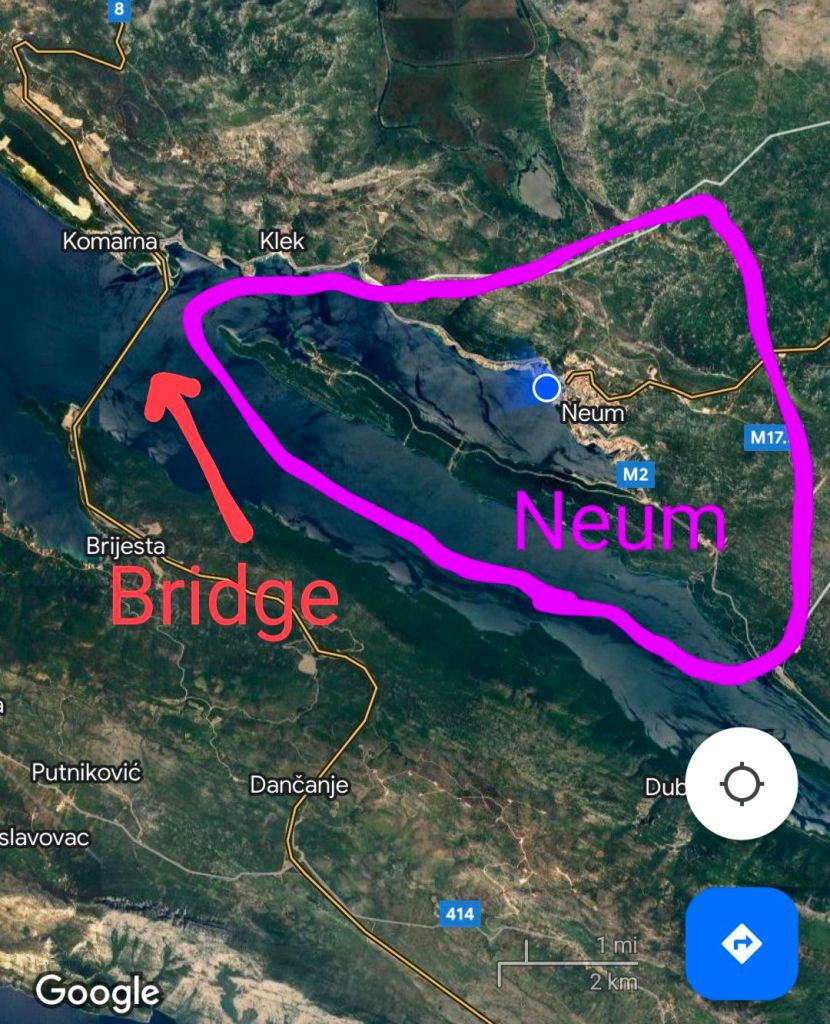 But this caused issues for Croatia after the breakup of Yugoslavia because another country now cuts Croatia’s coastline into two. So until recently, to drive between Split and Dubrovnik, two of the main cities in Croatia, one had to drive through BiH to get there! In fact, I took this route on a bus ride back in 2021 from Dubrovnik to Split, which required going through border control twice. This driving route became more congested over the years as tourism increased dramatically in Croatia. And it was untenable for Croatia to join the Schengen Area, which requires both “check in” and “check out”, which would have added a third border control point to the drive. To solve both of these issues (traffic and a barrier to Schengen membership), a large bridge was constructed between the northern Croatian mainland and a large, long peninsula jutting out from Croatia’s southern mainland, fronting Neum’s coastline. In this way, one can remain in Croatia, never having to pass through BiH, while driving between northern and southern Croatia. The bridge opened in July 2022, and Croatia officially joined the Schengen Area in January 2023, allowing for people traveling from other Schengen Area countries (28 other European countries as of this writing) to enter freely without a visa. The bridge was constructed by the China Road and Bridge Corporation (Chinese state-owned) at a cost of over 420 million euros. It was the first time a Chinese company won the bid for a project funded by the European Union! The bridge is free to drive across, and I drove over it in October 2023, though strangely I have almost no memory of having done so – I guess I was tired of driving by that point, after having driven up from Montenegro. One can clearly see the bridge in the distance from Neum.