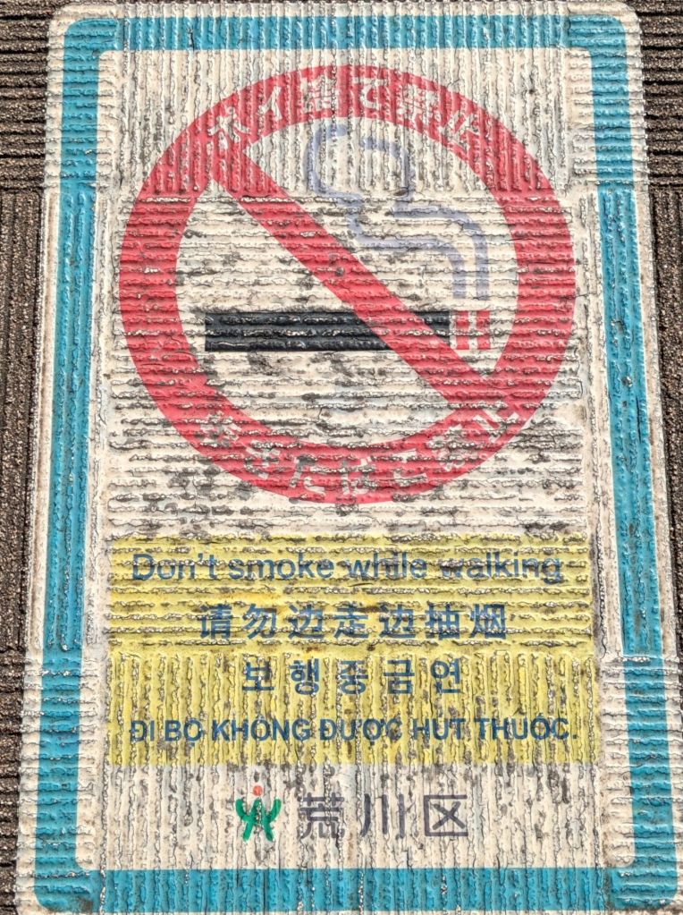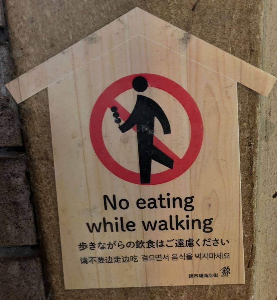 Which leads me to the next surprise — the lack of public trash and recycling receptacles. In Tokyo in particular, there are extremely few trash or recycling cans for public use, but you notice this lack in Kyoto and Osaka too. It’s intentional, and it’s why you will notice that everyone carries some sort of bag with them, like a backpack, so that they can carry home any trash they’ve accumulated during the day, including the reams of receipts that shops love to give out. And in that bag you can also carry your towel for wiping your wet hands after a restroom trip. Interestingly, another surprise was that every restaurant provides a plastic-packaged moist towelette before the meal for wiping hands (but no, not the face!). But just be sure not to take a step while enjoying your meal…
