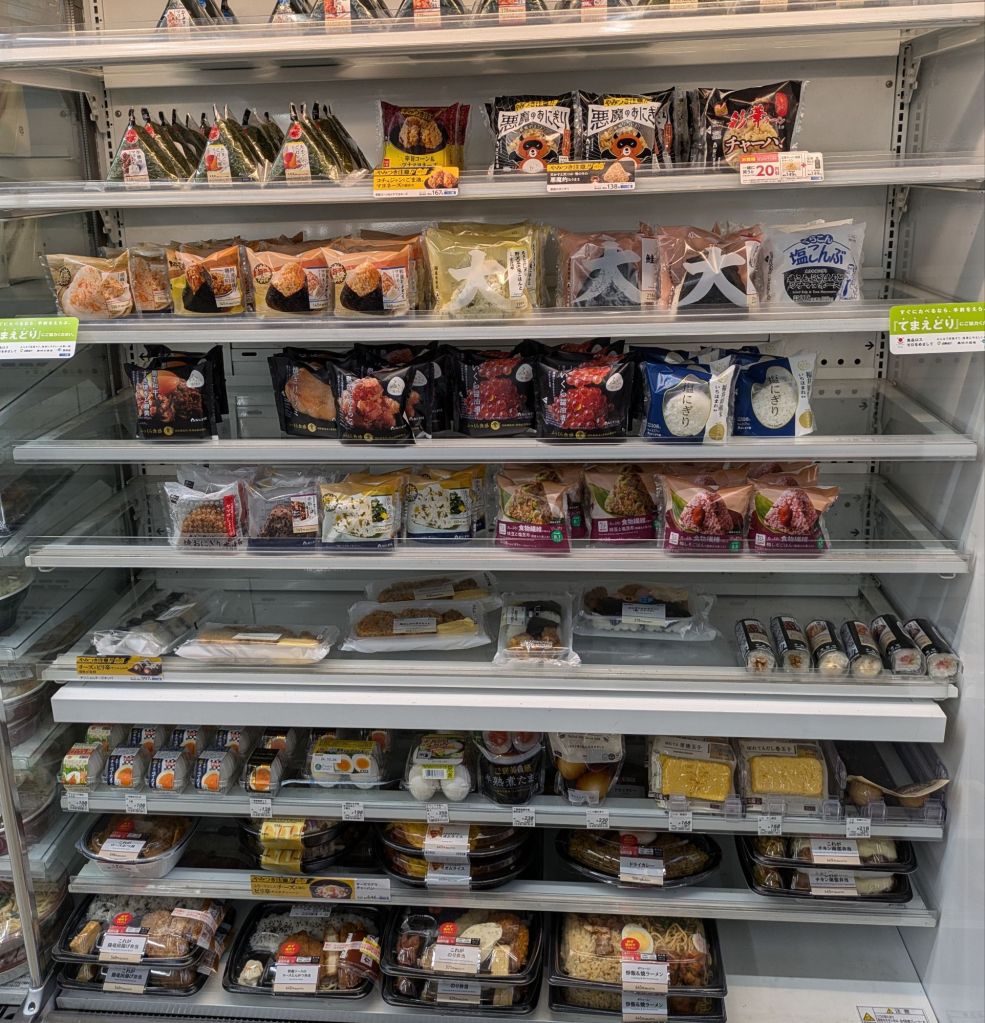 Plastics for containing foods and drinks are everywhere in Japan, even for items that arguably don’t require plastics. As previously mentioned, a moist towelette is delivered in a plastic container before every meal out. And there are vending machines offering various drinks in small plastic containers, with these machines distributed conveniently all over the cities such that larger bottles aren’t common, and they wouldn’t fit into the rare plastic bottle recycling receptacle anyway. Convenience stores are ubiquitous, and are often leveraged for getting a quick bite to eat, with most foods offered with plenty of plastic wrapping. Even the bananas are plastic-wrapped! So you better have your backpack ready to carry home both the peel and the wrapper.