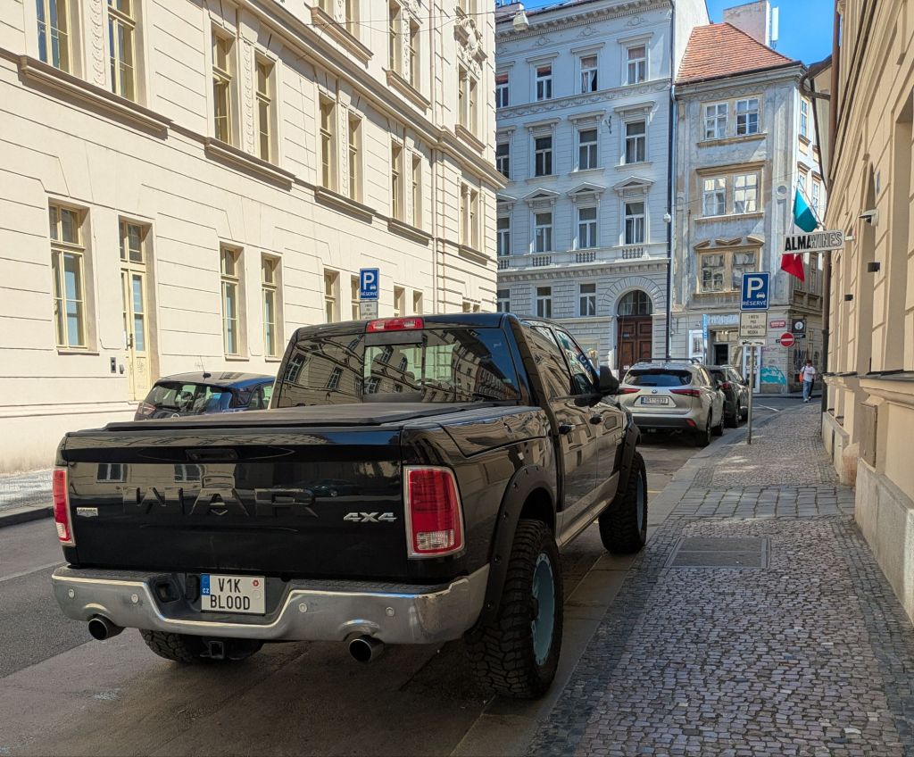 You know that I like sharing Czech words without vowels. Here’s another: “vlk” – it means “wolf”. On a related note, there are so few big personal trucks in Prague that it’s noteworthy when one is encountered around the city. There’s this one big pickup that parks near the building where I take the course, and because it’s an American truck it has to have a special license plate to fit the plate mount area. European license plates are shorter but wider than American plates. The plate on this particular truck is also personalized, which is also relatively rare around here, but whoever this guy is (I’m presuming it’s a guy) who owns it, he’s gone all out. The plate says “V1K BLOOD”. Now maybe that isn’t meant to be “vlk” (wolf), but perhaps? Funny too that he somehow took the “RAM” letters and reversed the positions of the R and M, and then turned the M upside-down to make “WAR”. What’s that good for? You can also see that the truck is so wide that the wheels need to be parked partially on the sidewalk.