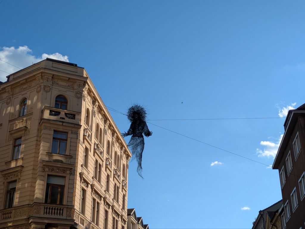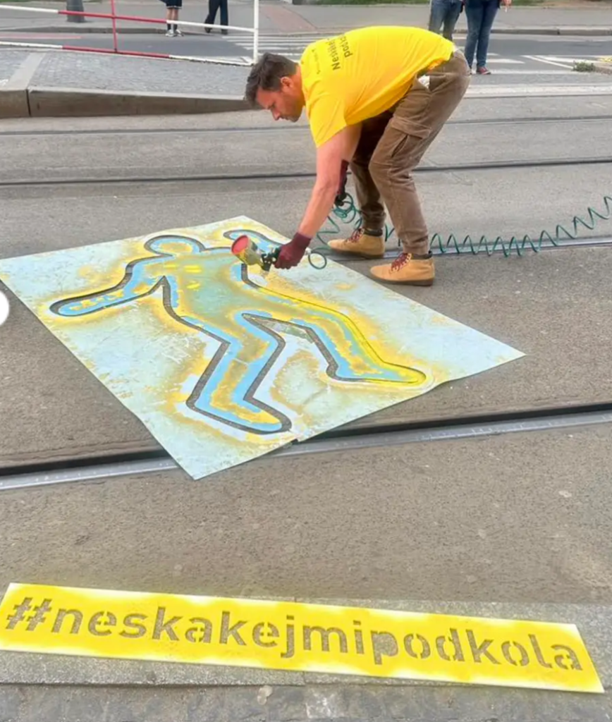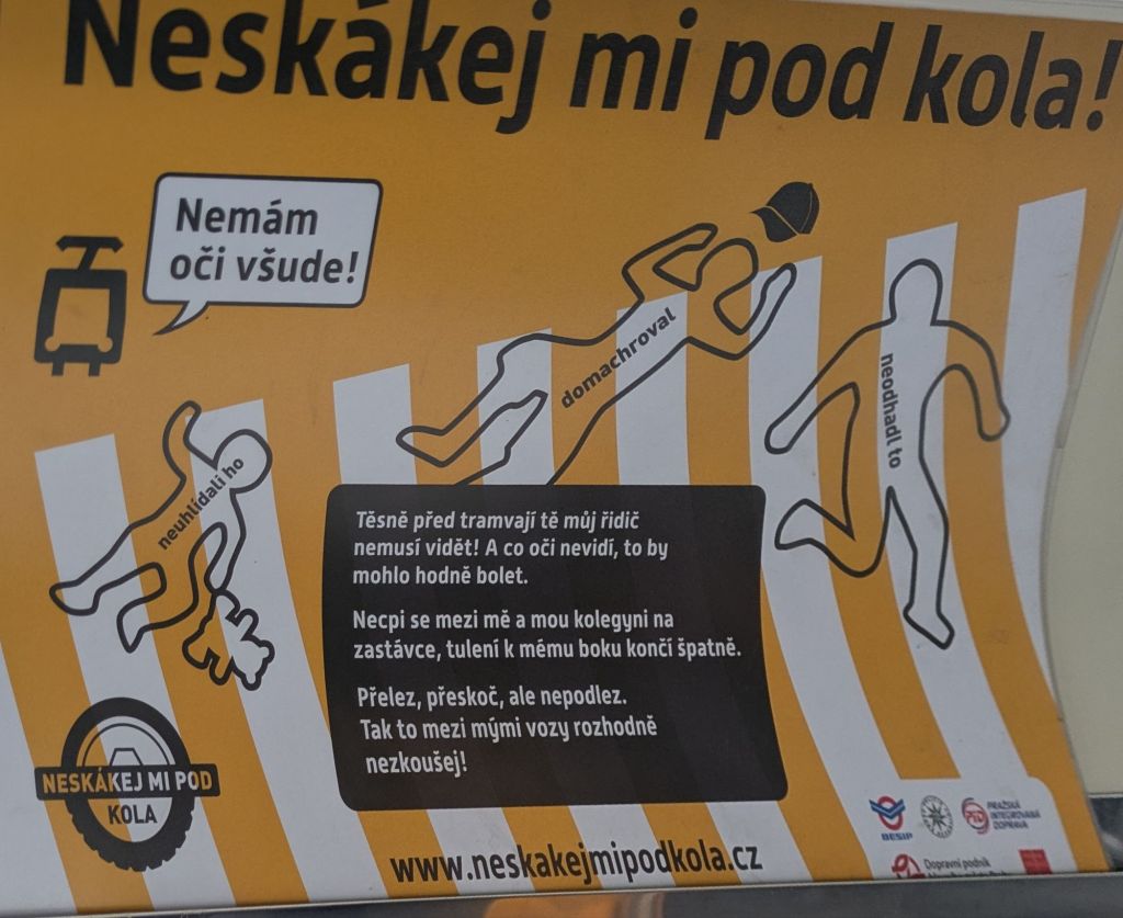 Every year people are unfortunately struck by trams in Prague. The city has an extensive system with trams passing regularly at each stop. At some intersections you’ll see a handful of trams passing at once. Prague is known to have an excellent and affordable public transport system. A tradeoff with trams is that they drive along the roads and don’t stop for pedestrians. They often travel quickly, and it’s easy to be surprised by a tram coming around a corner. I’ve not seen an accident myself, but I’ve seen a lot of close calls with cars, pedestrians, and electric scooter riders. The tram drivers ring a bell in warning, but sometimes reaction times aren’t fast enough. You can find videos online of trams smashing into vehicles. The transport folks began a public service campaign, painting “victim” outlines at some of the most dangerous tram areas. In April a 12-year-old boy was tragically hit and killed when he stepped in front of a tram.