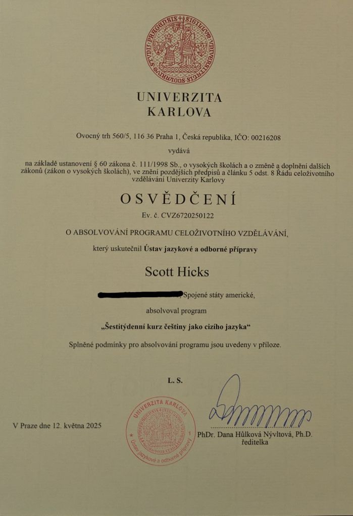 Thank you for this nice sentiment, Joe! I tried my best in the course, and I don’t feel I could have realistically done any better. Beforehand I had hoped we would reach level A1, but quickly learned that we wouldn’t. In other simpler languages such as Italian, Norwegian, or French, we would have surpassed level A1. I’m planning on meeting Sabine in Dresden for lunch in June when I go to pick up my long-term Czech visa!