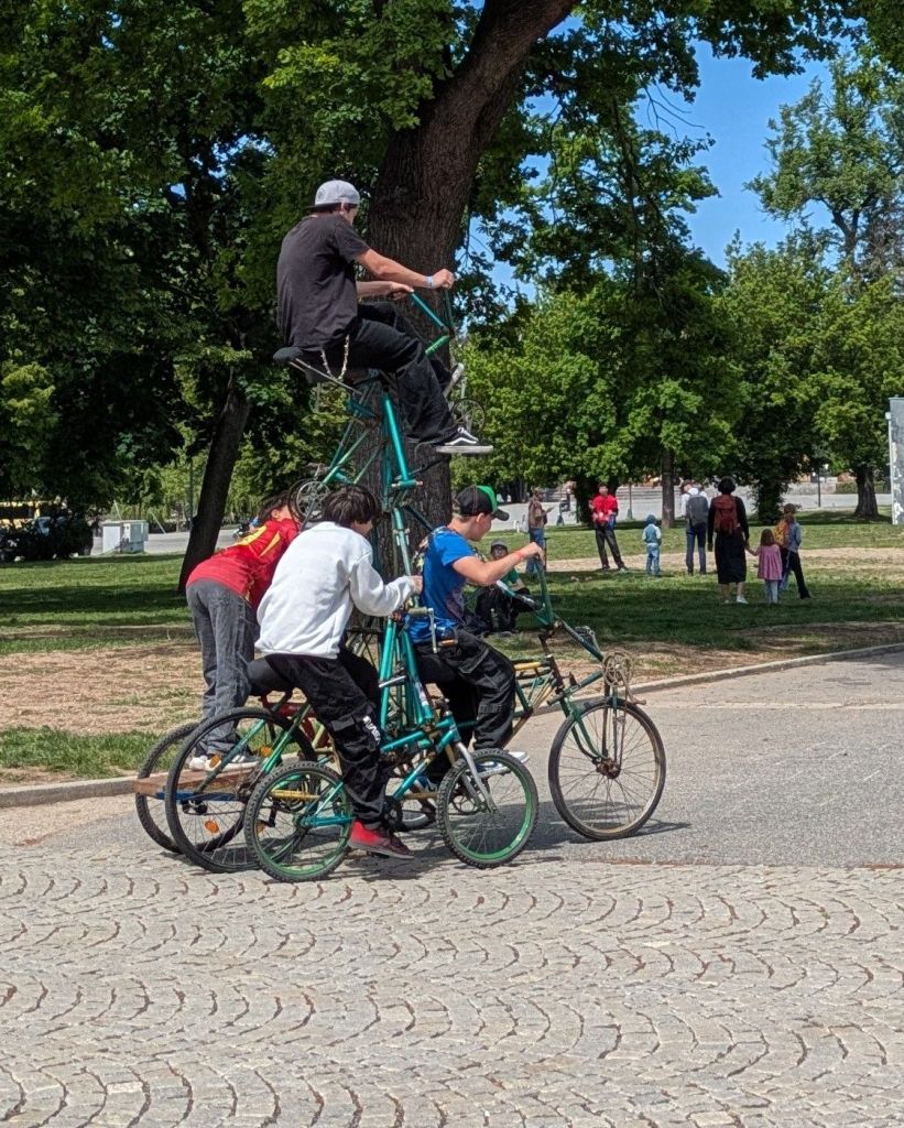 There was a Maker Faire exhibition in Prague recently, and when I walked through the free outdoor portion, I found a handful of unique creations, such as a robotic band playing a stage show with drums, keyboard, and bass, along with a two-level four-seater bike! Further, there was a pair of what appeared to be giant hamster wheels, connected together and with one young boy in each, spinning these wheels by walking.