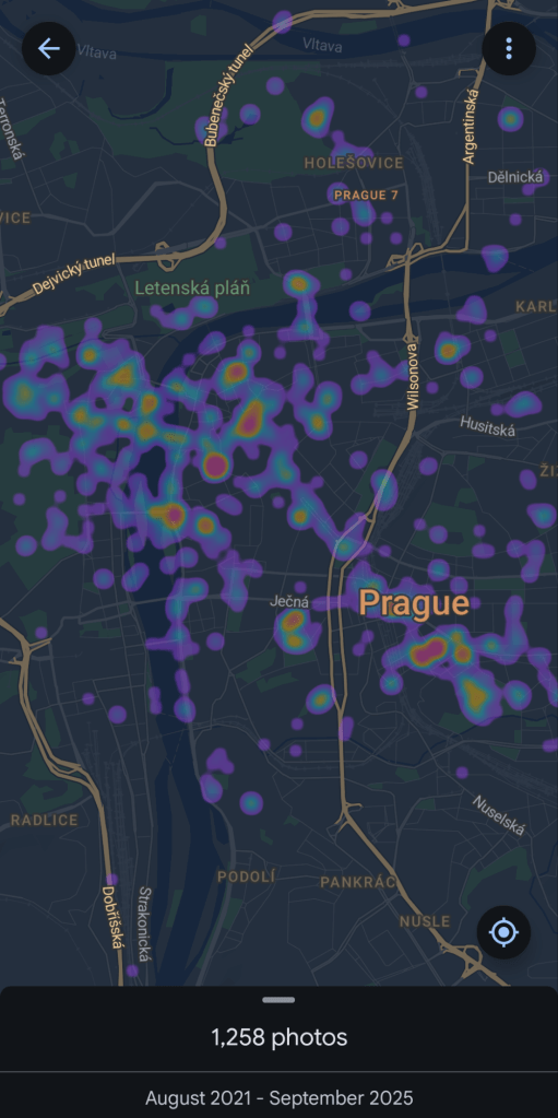 I accidentally ran across this in Google Photos: If you save location with your captured photos, you can view a heat map of where you’ve taken pictures across a geographic area. Here’s Prague for the past four years for me, and it’s rather insightful:
