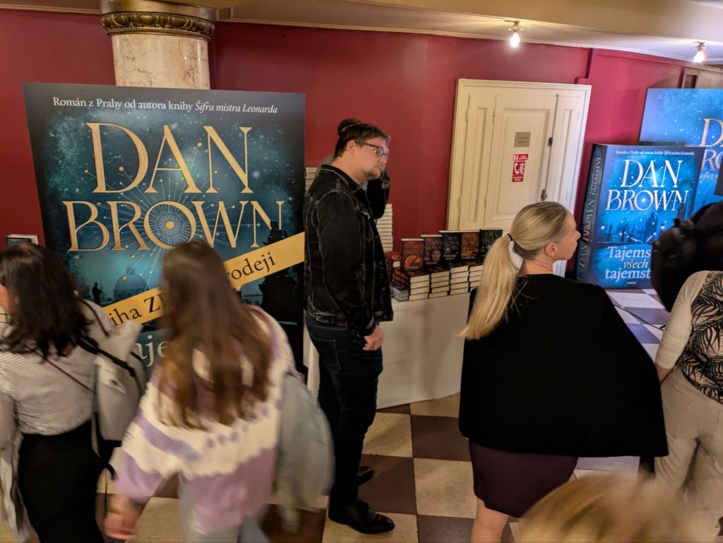 There was a moderator on stage, along with Dan, Dan’s editor, and the Czech editor. They spoke for 2 hours! It was interesting, and there are some real fans here in Czechia. Everything was done in English, and Czech speakers who didn’t know English well enough (there were surprisingly few) could borrow a headset for live Czech interpretation. My friend (who is Slovak) introduced me to some other people, including a Slovak travel agent who says that she’s recording all the places in the book to be able to direct clients! The tourists are expected… Dan himself said that he tried to emphasize that the story takes place in the winter so that tourists will come in the winter, when there aren’t traditionally as many tourists. The crowd applauded that! (I thought Asheville was over-touristed!)