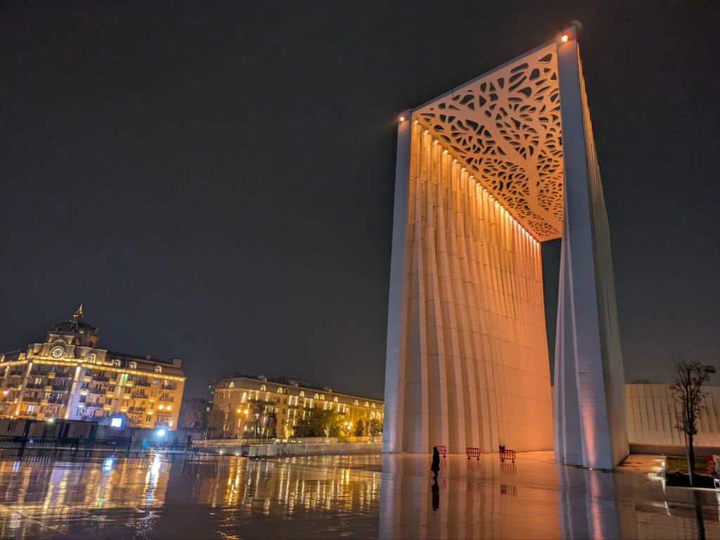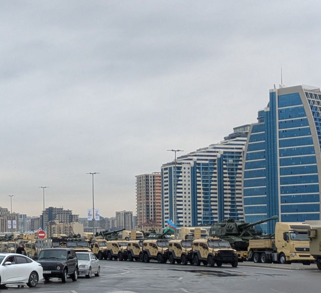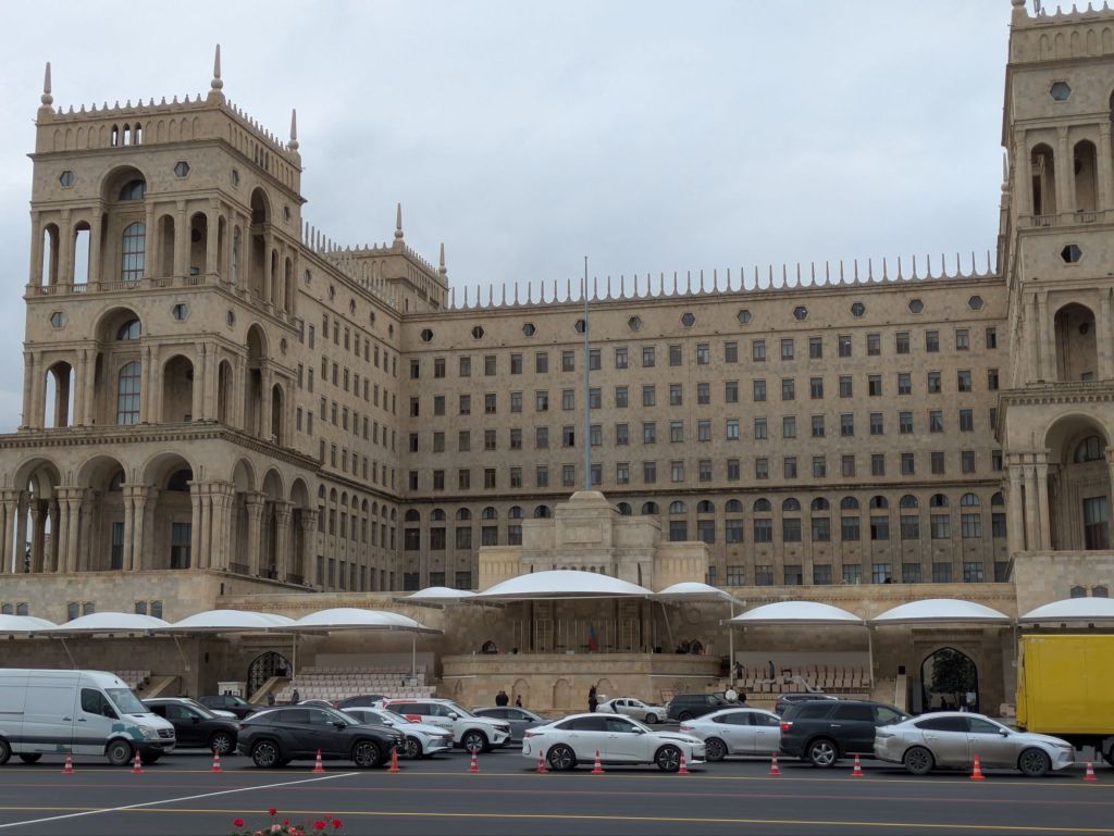 This tension is palpable, and Nov 8 is a public holiday currently advertised (in the days leading up to this Victory Day) on government building banners with a logo of the president’s fist, commemorating Azerbaijan’s victory in the Second Nagorno-Karabakh War with Armenia. There’s also a War Remnants Park, or as the Azerbaijanis seem to prefer to refer to it, a war “trophies” park, with a huge outdoor collection of Armenian military apparati damaged or destroyed during the various conflicts between the countries. I tried to visit during my stay, but the only way in was from a road which was blocked off, as it was lined on both sides and in the middle with seemingly endless rows of modern Azerbaijani tanks, missile launchers, and various other military vehicles. These were presumably collecting on November 4 (the day of the photos) in preparation for the weekend’s planned giant November 8 military parade. Using Maps, I measured that there were 3 kilometers (almost 2 miles) of these vehicles lined up! And there were three rows, so that’s 9 kilometers total of vehicles! As far as the eye could see.