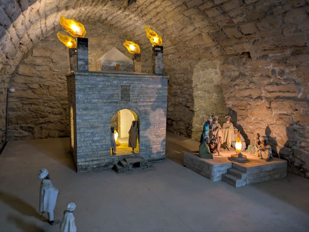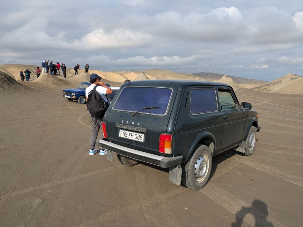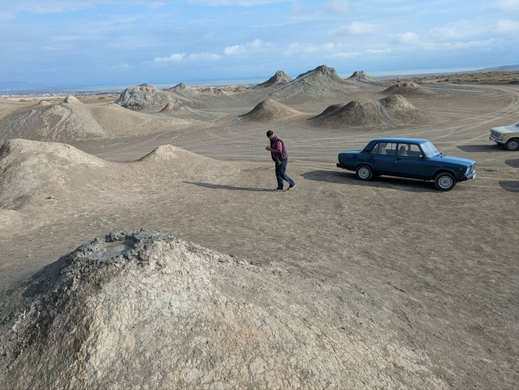 And the peninsula around Baku holds hundreds of mud volcanoes, fire continuously shooting out of a hill, an old Zoroastrian fire temple, and 12,000-year-old petroglyphs carved by long-ago ancestors. To get to the mud volcanoes, we had to cram into a creaky, old, gas-stinking Lada and speed over a hilly and rocky terrain, avoiding potholes and oncoming fellow Ladas and other vehicles over blind hills. Flammable outputs are seemingly omnipresent around here, and the flames baffled peoples from past millennia, understandably leading to lots of fire worship. It can also be very windy on this peninsula, and wind and fire are not a great combination. Baku is known as the city of winds.