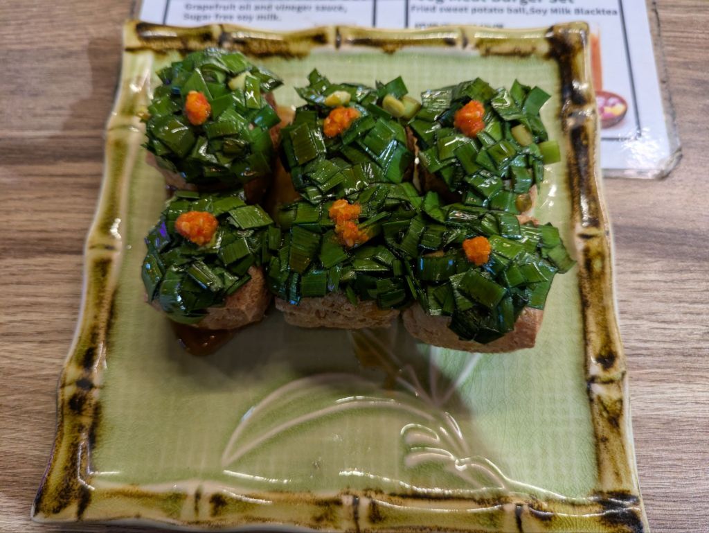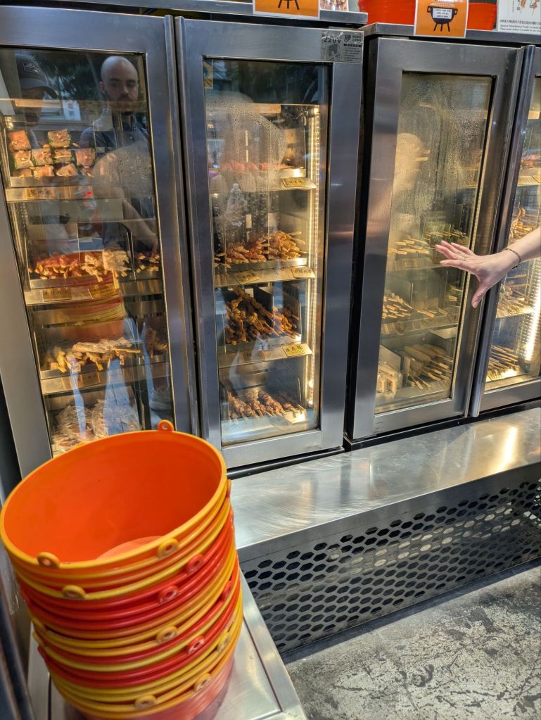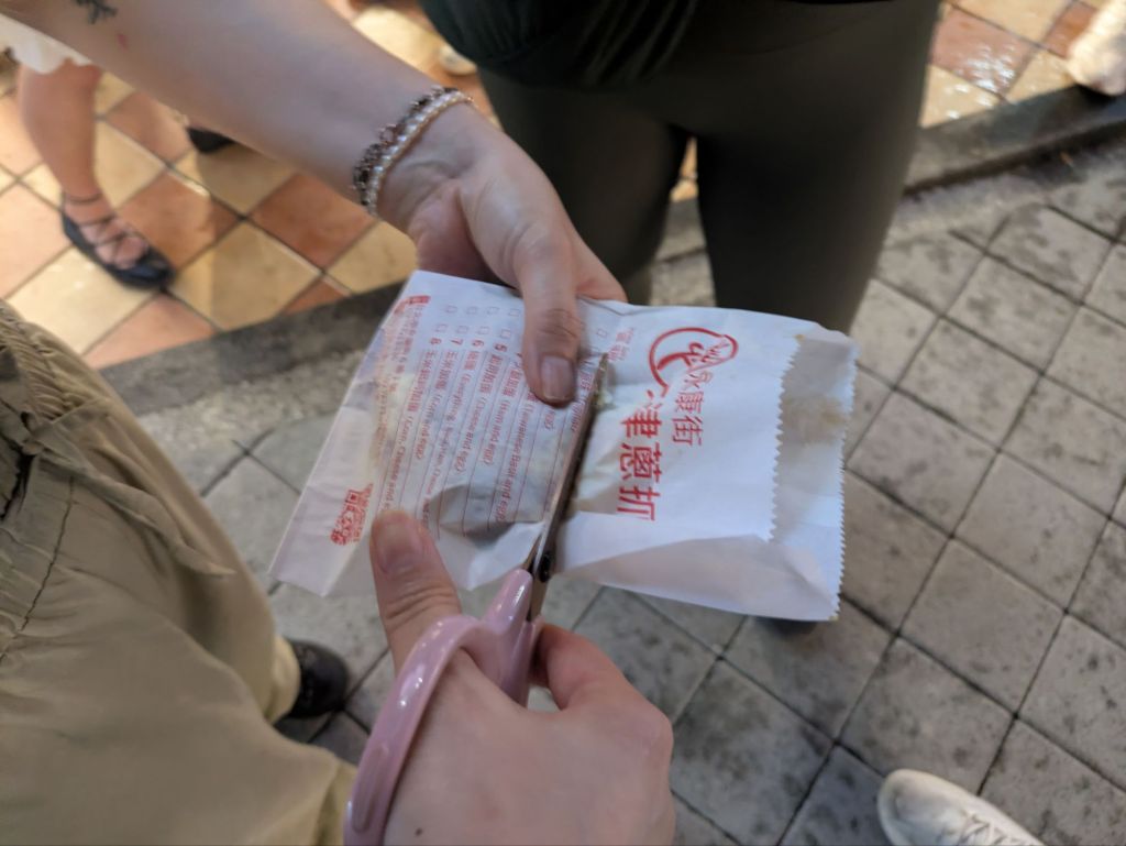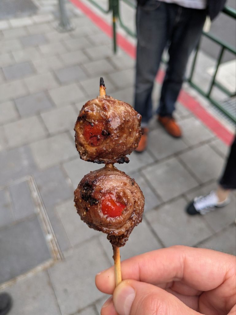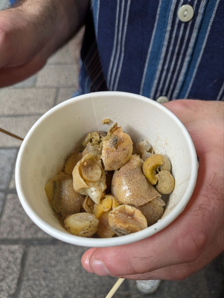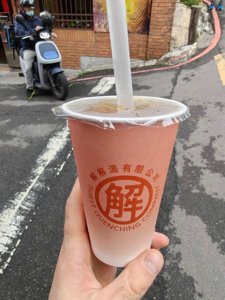 Drinks are big too, including tea, understandably, but also beer. And boba tea, or bubble tea, aka pearl milk tea, was invented in Taiwan in the 1980s and has become quite popular all over the world. There’s even a bubble tea shop in the underground passageway to the metro stop near where I’m currently staying in Prague. Various types of teas are offered at bubble tea shops, typically with milk added, and then you choose hot or iced, the amount of ice, the amount of sugar, and what type of pearls or other additives to throw in. Typically the pearls are chewy tapioca balls, and a wide straw is offered to allow for the pearls to be sucked up. I was dubious about the whole thing, but figured I should try one. I found that a matcha latte with ice, no sugar, and tapioca balls was very flavorful, and I enjoyed the texture contrasts. So much so that I bought similar bubble teas later in the trip in other places like Hong Kong, Australia, New Zealand, and Singapore!